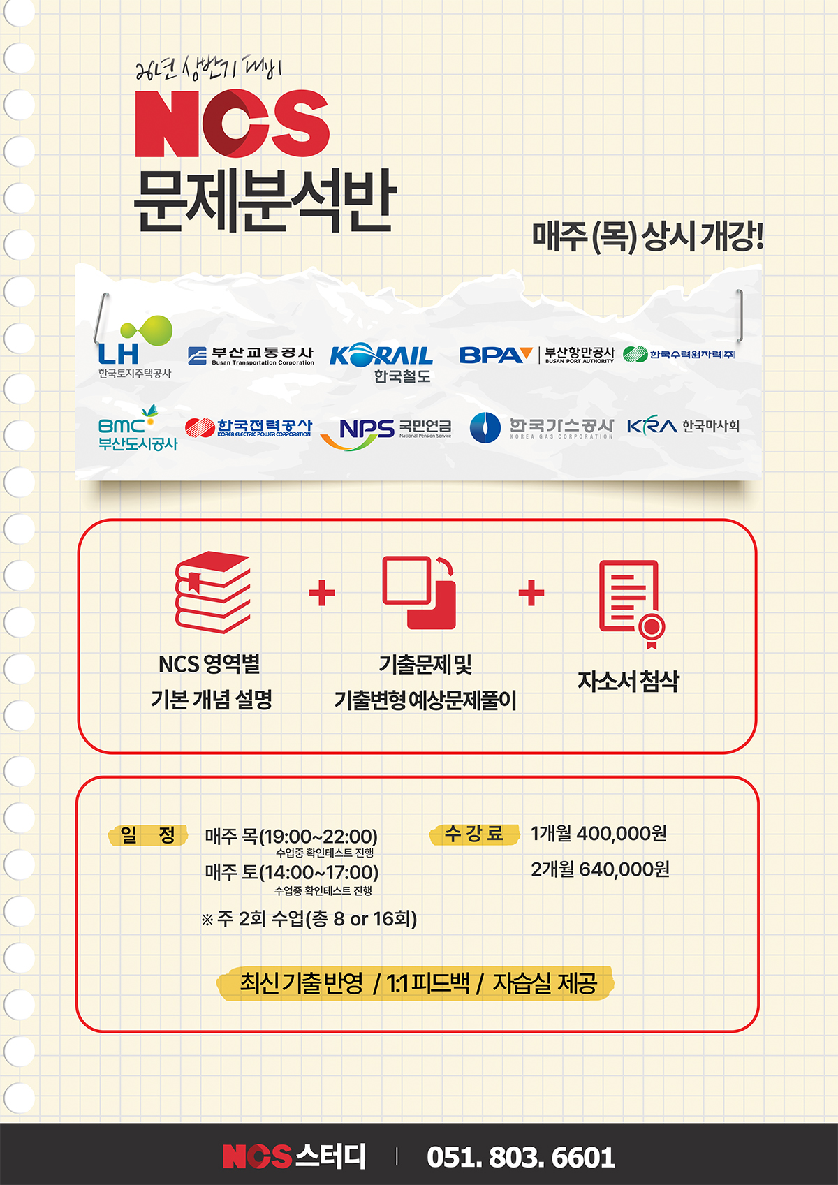 2026 상반기 부산통합채용 필기시험대비 NCS문제분석반 상시 개강!