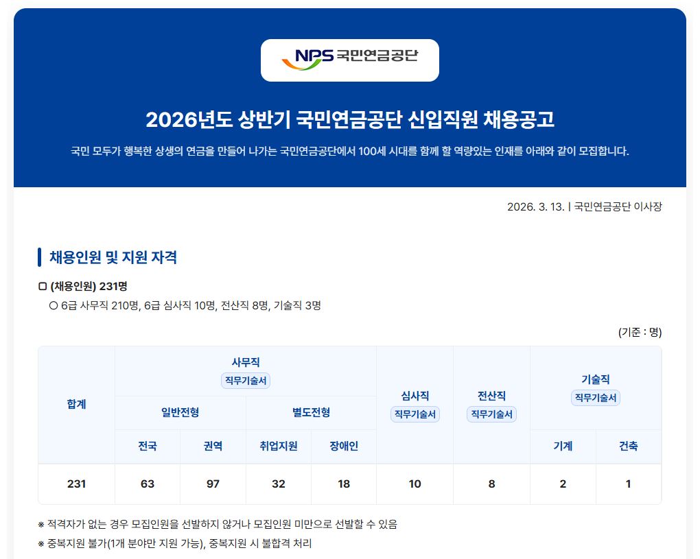 2026년 상반기 국민연금공단 일반직 신입직원 공개채용 공고