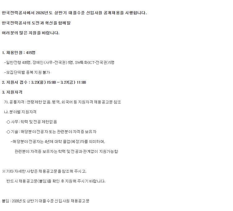 2026년 상반기 한국전력공사 4직급 대졸수준 신입사원 채용 공고